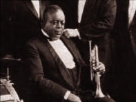 with his cornet, Louis Armstrong stands to the right of